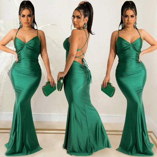 2022 New Arrival Women Sexy Bandage Backless Solid Color Halter Dress Hot Sale Ladies Long Bodycon Green Bridesmaid Dresses